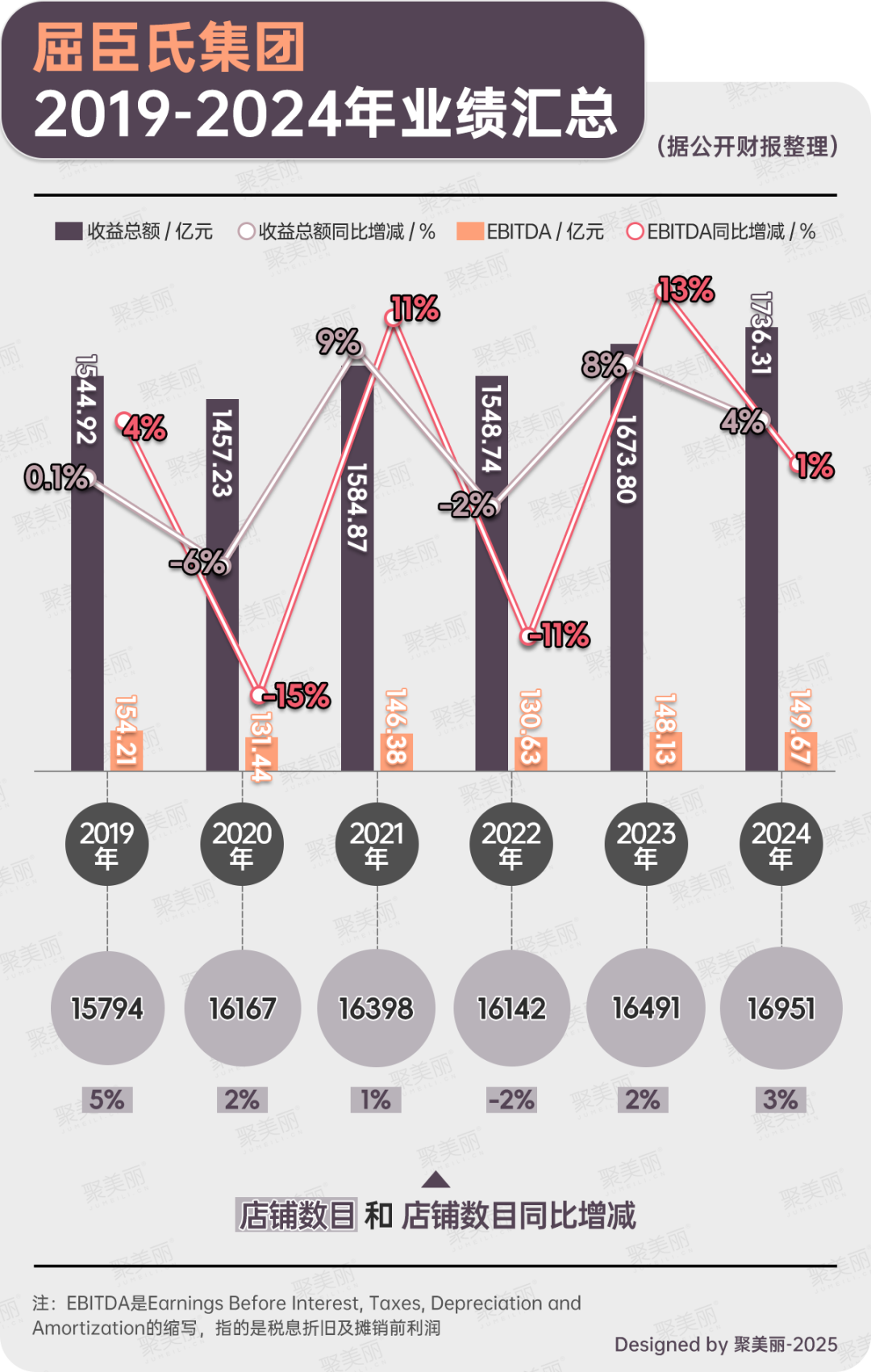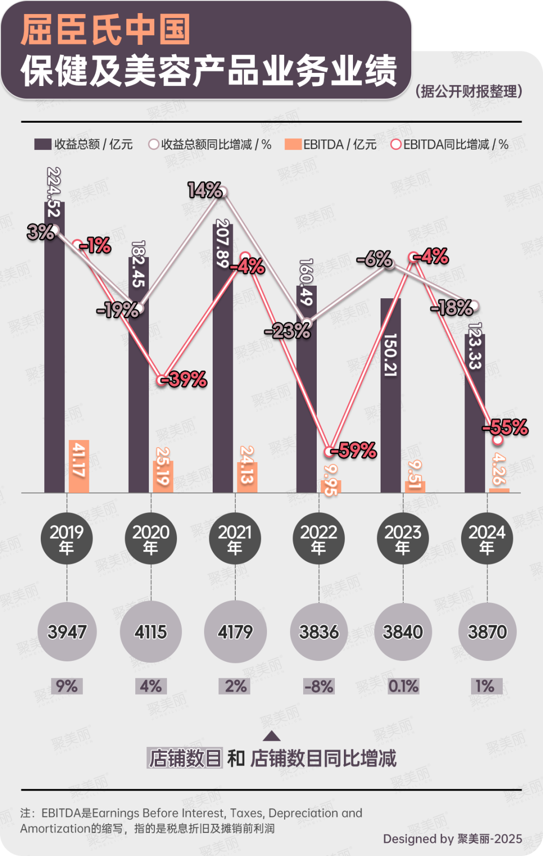 从财报来看,屈臣氏集团在全球及中国市场的表现均不尽如人意。从下图来看,屈臣氏集团虽在2024年创下店铺数量高峰,但仍难掩颓势——收益额、EBITDA(税息折旧及摊销前利润)双双增速放缓,且在2019-2024年期间还出现多次业绩下滑。