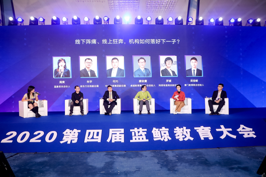 第一场圆桌论坛由蓝象资本合伙人周爽主持,与新东方在线副总裁朱宇、中公教育集团副总裁何玓、卓越教育集团联合创始人唐俊膺、网易有道高级副总裁罗媛、掌门教育联合创始人吴佳峻五位嘉宾围绕着“线下阵痛、线上狂奔,机构如何落好下一子”的论题,展开分享。