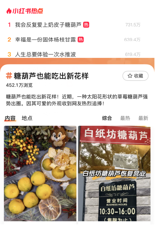 在小红书上,“我会反复爱上奶皮子糖葫芦”曾登上热点话题TOP1,“留子也开始好奇奶皮子糖葫芦了”、“糖葫芦主理人没有创作瓶颈吗”等话题的讨论度也居高不下。在大众点评上,“想出奶皮子糖葫芦的人真是天才”浏览量高达近千万,“北京新出奶皮子糖葫芦”、“糖葫芦也能吃出新花样”都是官方热点话题。而在抖音上,每天都有奶皮子糖葫芦的爆款短视频诞生,有的点赞量高达200w+。