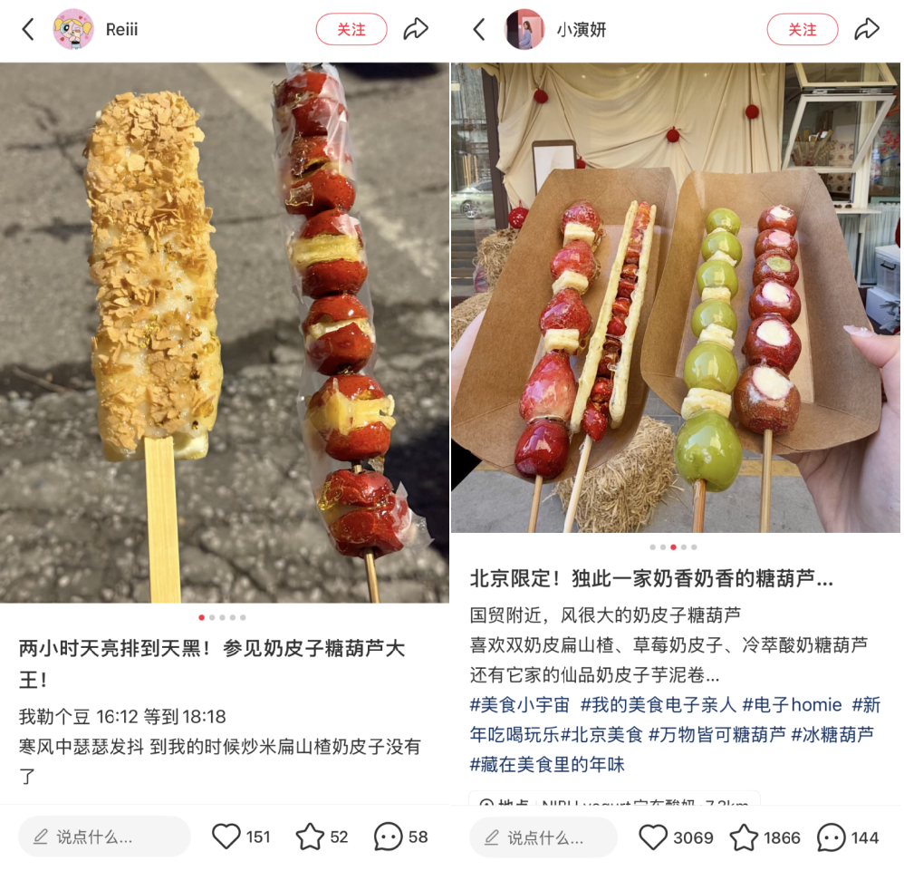 “去年北京就有卖,没想到今年突然爆火。大众点评一直在推,感觉不买一根尝尝都不行。”沁沁告诉TOP君,自己浏览过一条奶皮子糖葫芦的笔记后,就一直能收到类似的笔记,博主们的用词都是“必吃”、“快冲”,所以也想尝尝是不是真的这么好吃。