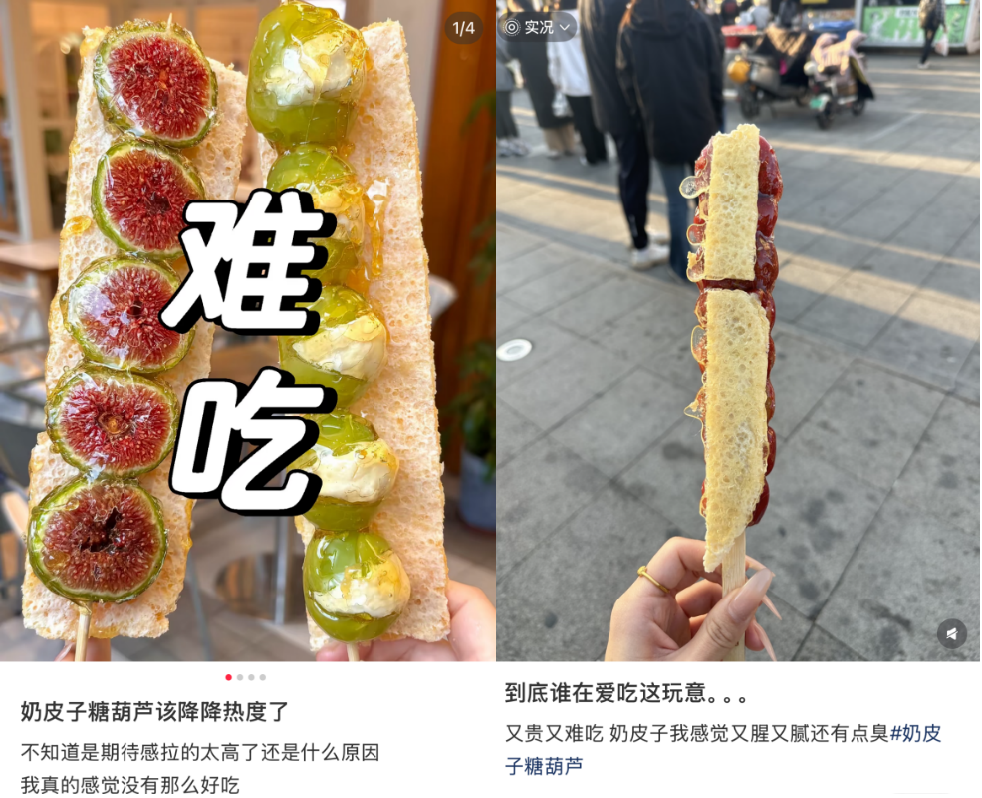 另一方面是行业乱象的集中爆发。市场上的奶皮子质量参差不齐、规格缩水,甚至出现了“造假奶皮子”。这些短期的逐利行为会消耗消费者的信任、透支品类的生命力。TOP君观察到,华贸购物中心最新推出的奶皮子糖葫芦就因奶皮子太小,被消费者吐槽货不对板。而不少跟风尝试的消费者也在社交媒体上表示,吃一次图个新鲜,不会复购。