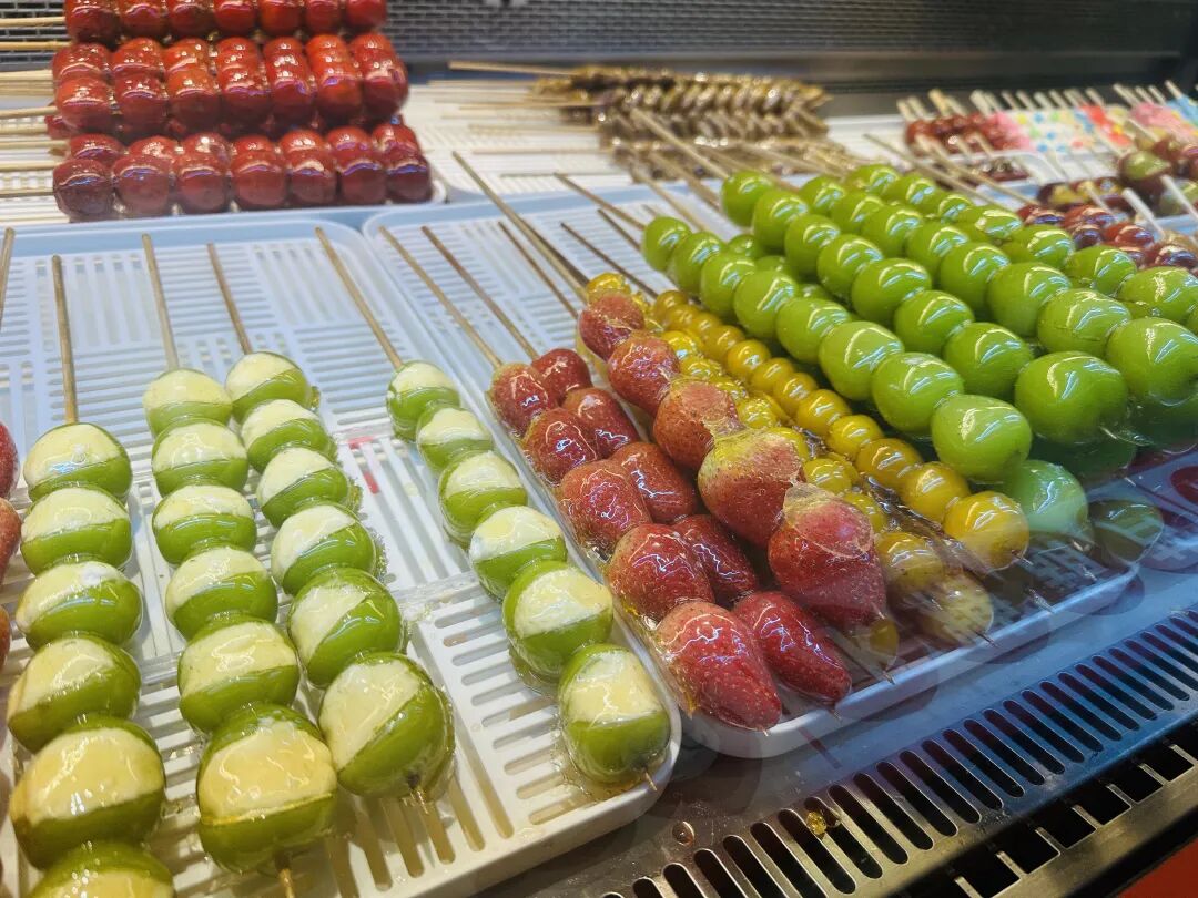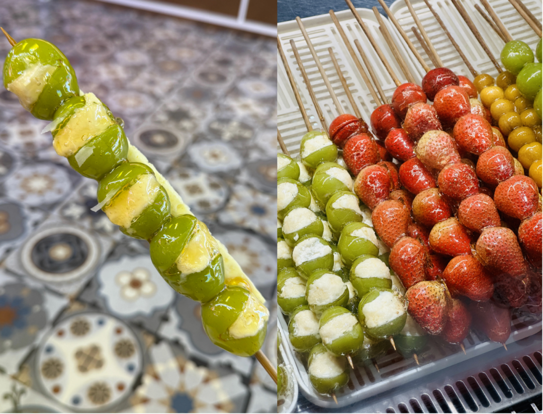 此外,还有一部分人是冲着奶皮子糖葫的高颜值去打卡的。当前,奶皮子糖葫芦除了传统的红山楂,还衍生出阳光玫瑰、草莓、红石榴、蓝莓等多种口味。当缤纷的色彩、洁白的奶皮和晶莹的糖壳组合在一起,就是出片神器。