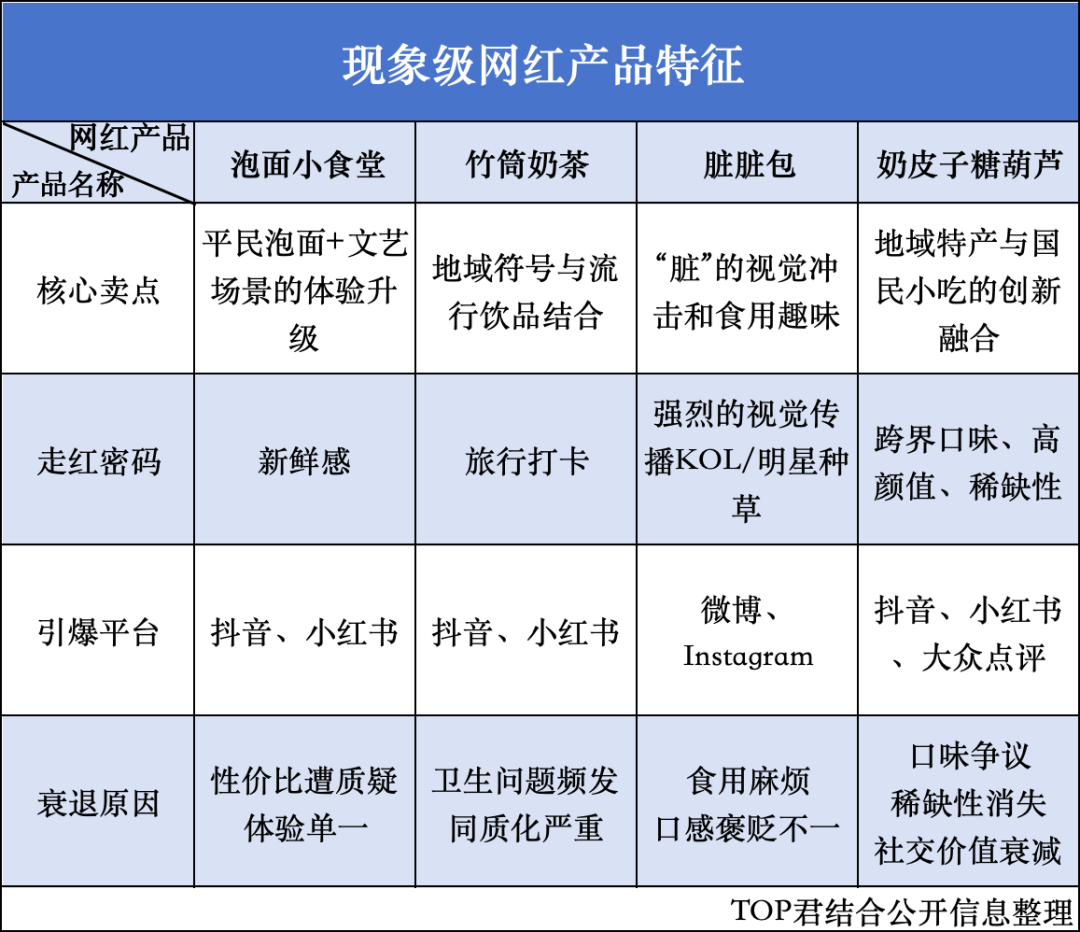 事实上,奶皮子糖葫芦并不是第一个享受社交媒体和广大用户追捧的产品。在互联网飞速发展和“打卡”文化盛行之下,脏脏包、泡面小食堂、竹筒奶茶、酸奶大麻花等都曾是朋友圈的“顶流”,也都有着同样的命运:爆红→过剩→消失。
