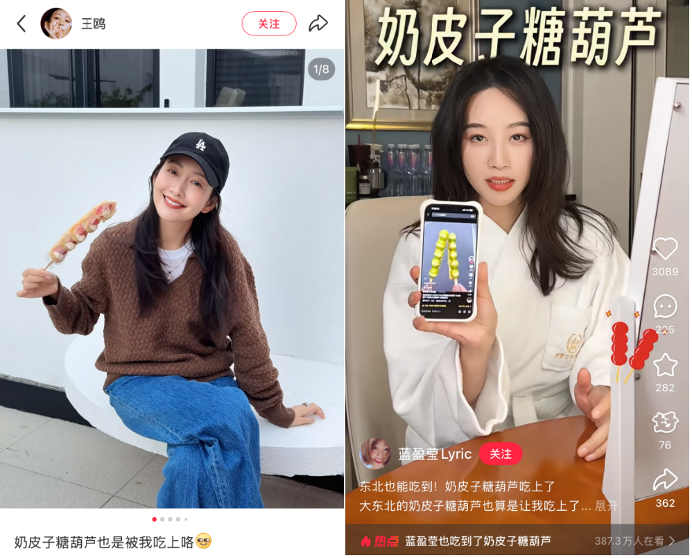 值得关注的是,在社交媒体的推波助澜下,不少明星也成为奶皮子糖葫芦的野生代言人。王鸥在工作间隙,举着奶皮子糖葫芦美美出片;在吉林拍戏的蓝盈莹直接出了一期奶皮子糖葫芦口味测评;在上海的阚清子也在社交平台上分享拔草的快乐瞬间。