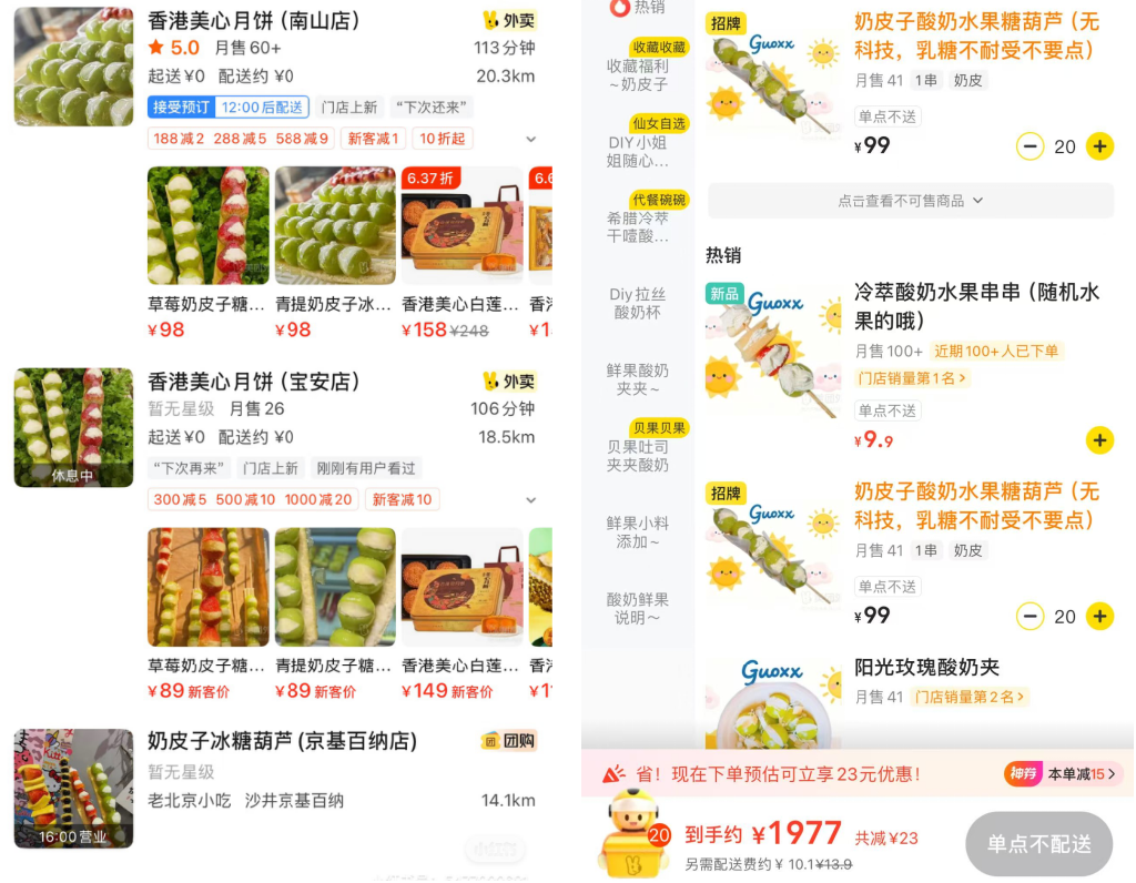 TOP君在浏览外卖平台时还发现,长沙、武汉、深圳、陕西等不少奶皮子糖葫芦的外卖单价高达98元/串。其中,长沙某糖葫芦外卖店铺显示,20串起送,月售41单。北京4环外的某糖葫芦商贩告诉TOP君,10月底开始做奶皮子糖葫芦,每天销量都很好。