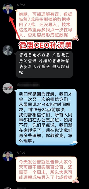 上述商户发来的截图显示,微盟CEO孙涛勇在群内表示,数据恢复七成是指删掉的数据找回七成,但还没导入,技术层面希望再多找点,一次性导入,否则易形成脏数据。