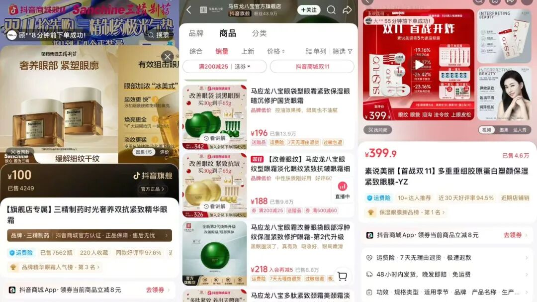 另一大药企三精制药则在2018年便试水美妆产业,但此前表现平平。直至今年8月,三精制药月GMV冲进千万级别,次月更是达1亿+。第三方数据显示,三精制药美妆在三季度TOP5爆品为气垫霜组合、气垫霜双瓶套组、特润霜三瓶套组、抗皱精粹水和精华眼霜双瓶套组。其中精华眼霜双瓶套组季度GMV达1000W-2500W,该产品的打法与马应龙八宝眼霜如出一辙,接近100%达人份额来自与辉同行。