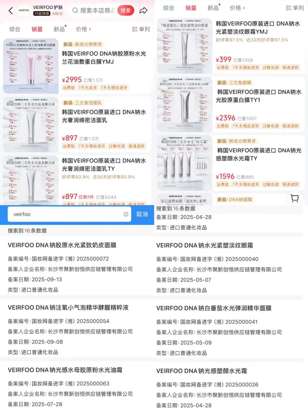 企查查显示,其商标归属2024年3月创立的中国香港藍沃(環球)有限公司,但抖音端自称“韩国院线尖端科学美容护肤品牌”。从化妆品监管APP来看,VEIRFOO累计备案16款产品,首个产品备案于今年4月,备案方为长沙市聚新创恒供应链管理有限公司,生产方为韩国CNP有限公司。