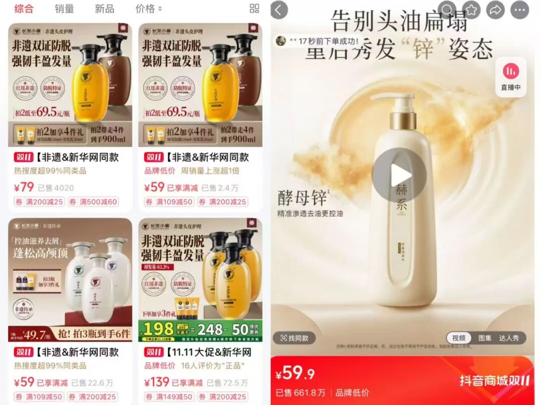 除了赫系之外,长发小寨势能也在持续拔高,三季度更是冲进TOP1。据悉,长发小寨创立于2018年,理念源自广西龙胜各族自治县红瑶长发村的淘米水护发传统。长发小寨自2021年进驻抖音,2024年起月GMV稳定在千万级,次年7月冲进5000W+且持续保持该体量。其大爆品为防脱轻盈精华液和淘米水洗发水,季度GMV均千万级。目前,长发小寨三季度超八成GMV由直播贡献,带货上品牌自营与达人推广并行,新华社、新华网及东方甄选是其主要捆绑的三大账号。