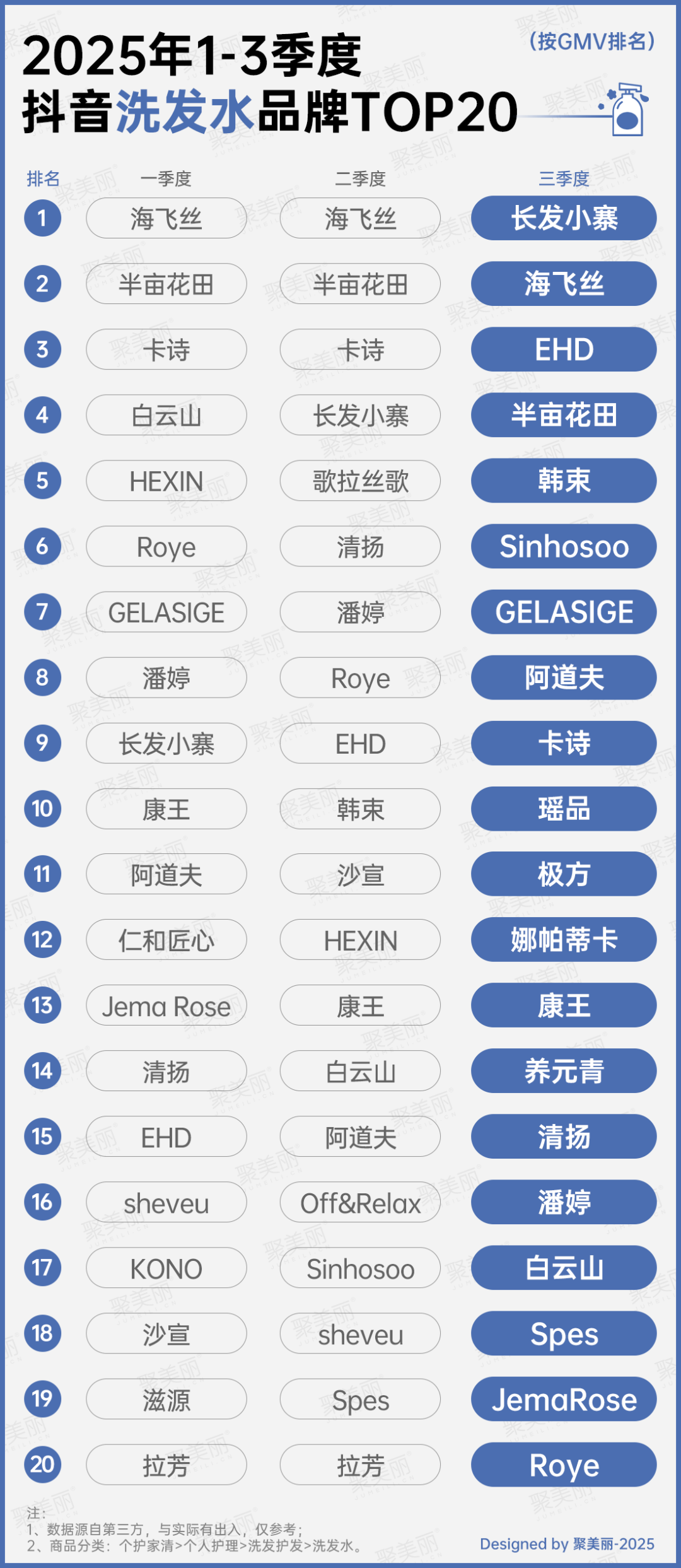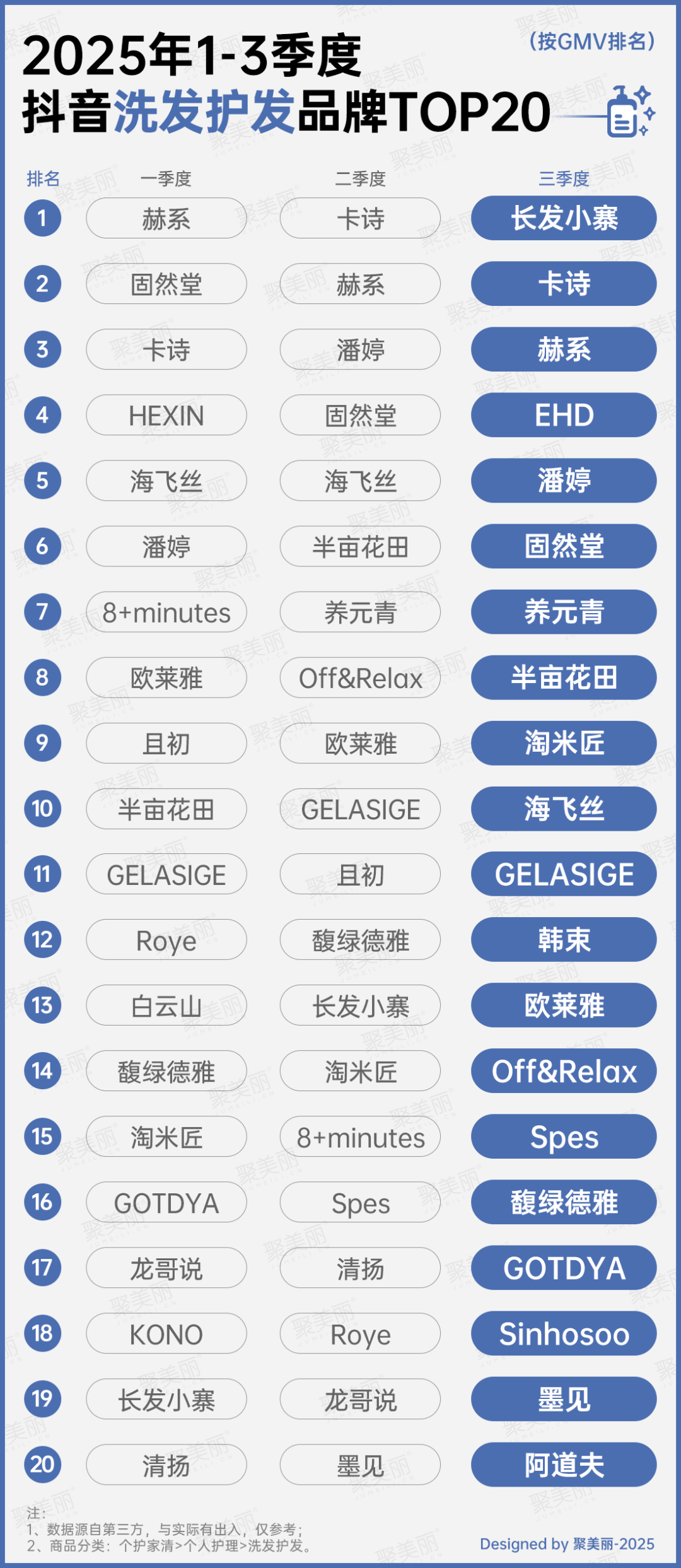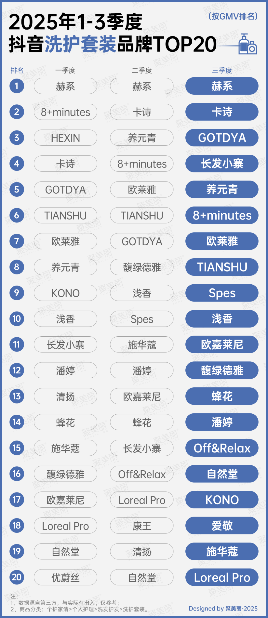 从洗发护发品牌TOP20榜单来看,各季度TOP1均不同,1-3季度分别是赫系、卡诗和长发小寨,前二者排名稳定在TOP3。同时,还有较为明显的趋势,国货品牌逐渐占领该榜,其中不乏大集团子品牌,如珀莱雅旗下Off&Relax二、三季度位居第8和14名,而云南白药旗下养元青位列第7。