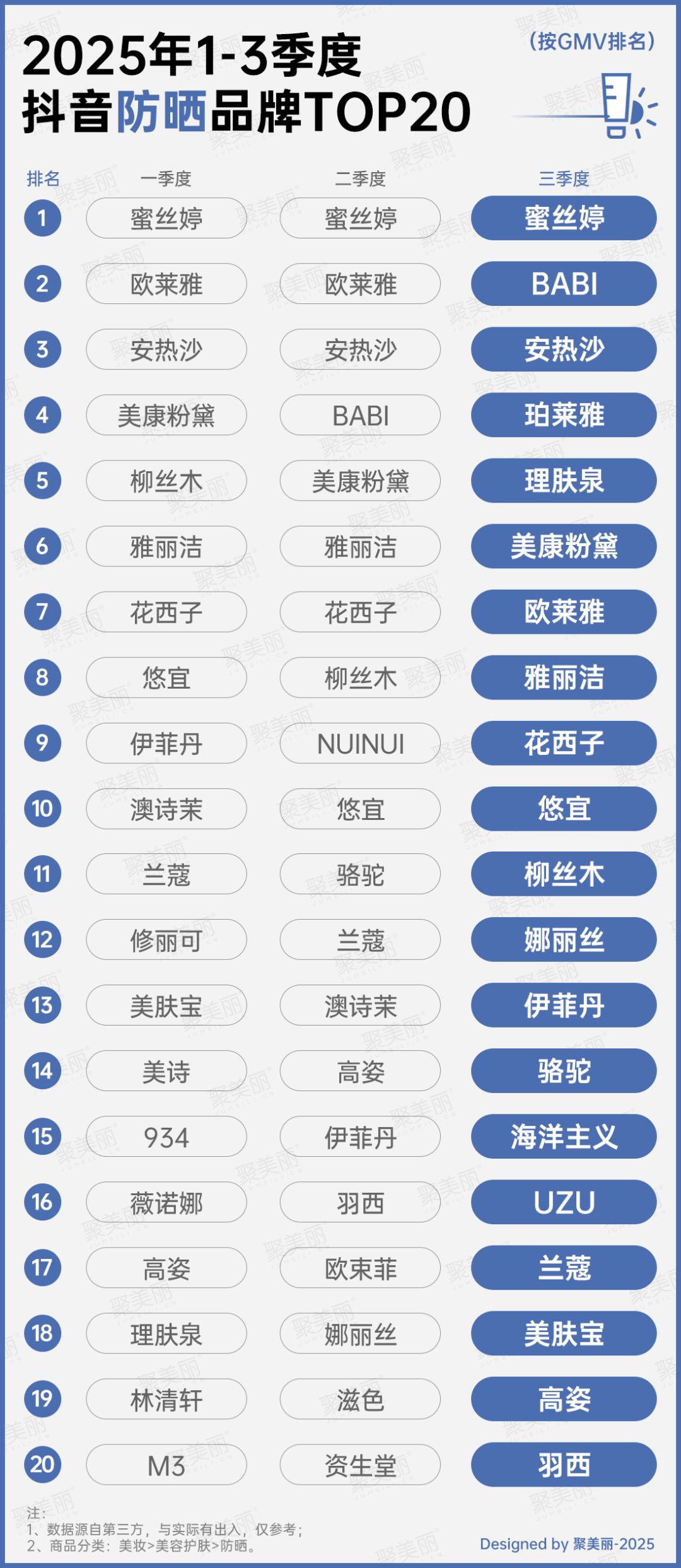 就防晒榜单TOP20来看,M3、UZU、NUINUI及骆驼等均属于较新面孔,而蜜丝婷持续霸榜TOP1。
