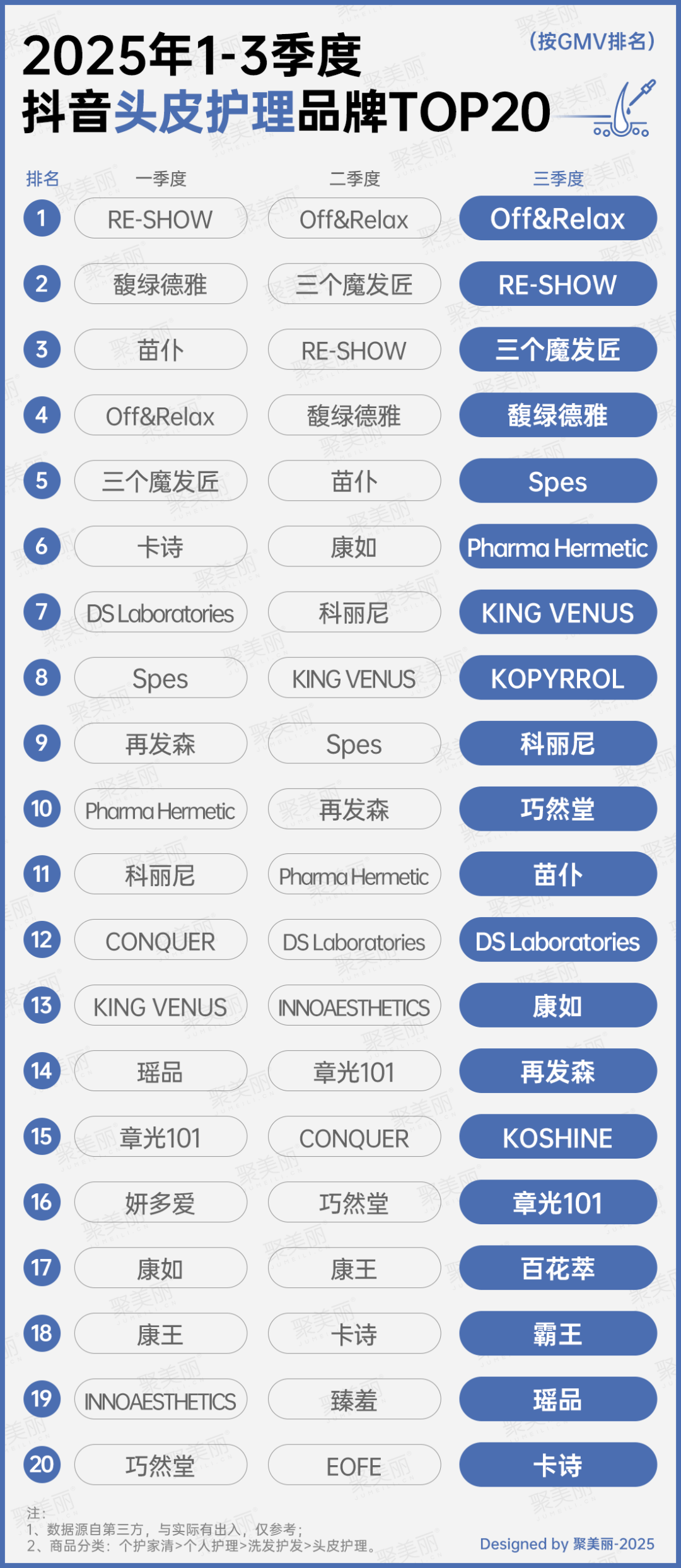 在头皮护理方面,珀莱雅旗下Off&Relax在二、三季度蝉联TOP1,RE-SHOW则三个季度均稳居前三,三个魔法匠则在二、三季度闯进TOP3。