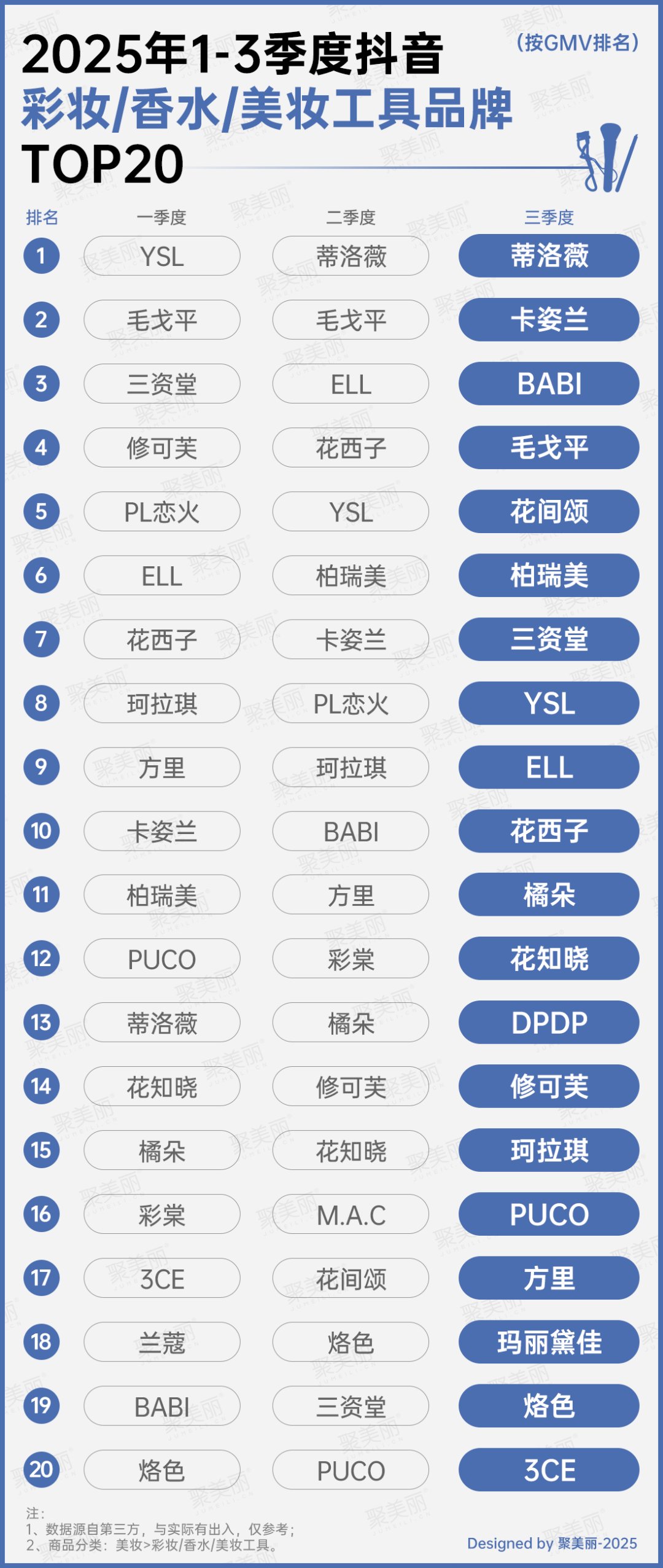 而彩妆/香水/美妆工具品牌TOP20榜相较而言,品牌格局相对稳定。YSL在第一季度登顶TOP1,后续两季度均为蒂洛薇霸榜。