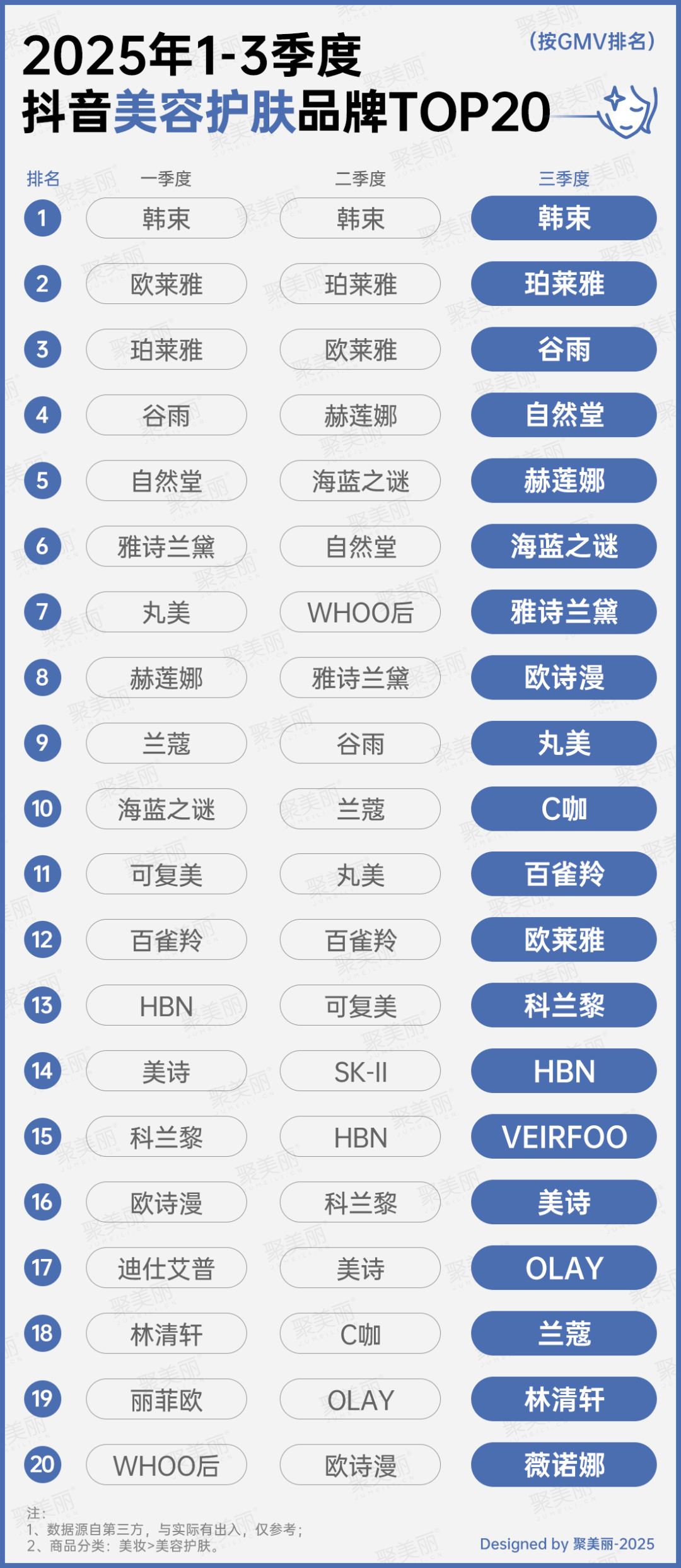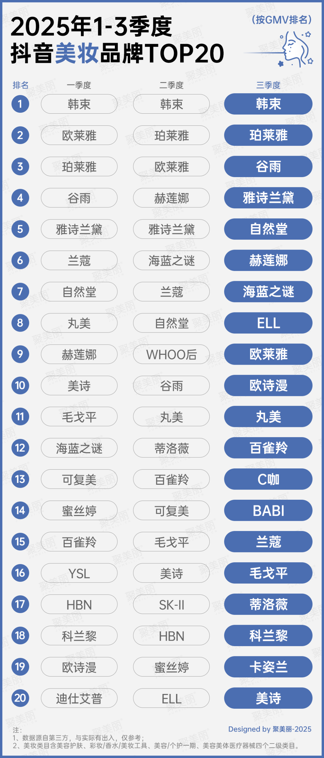 韩束蝉联三季度榜首,珀莱雅在二、三季度稳居亚军。相较之下,一季度曾高居第二名的欧莱雅则大幅下滑,三季度跌至第12名。