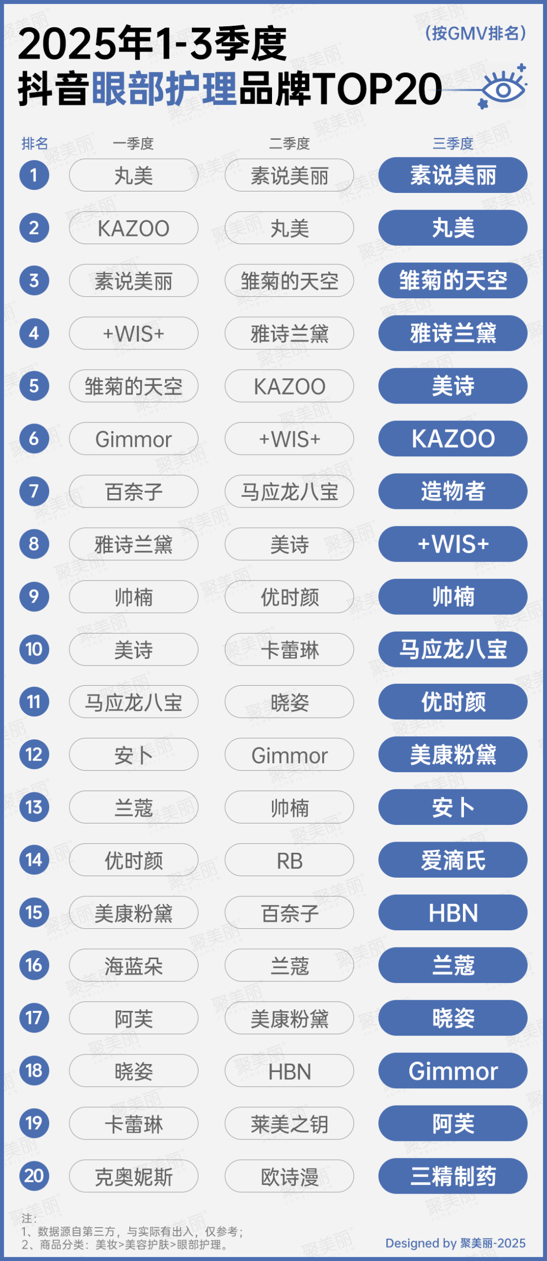 从眼部护理榜单TOP20来看,靠眼霜起家的丸美在一季度登顶TOP1,后续则是知名白牌素说美丽持续霸榜。同时,雏菊的天空、优时颜等拥有眼霜大单品的新锐也在榜。国际大牌中,雅诗兰黛在二、三季度均进入TOP5,兰蔻也挤进TOP20。