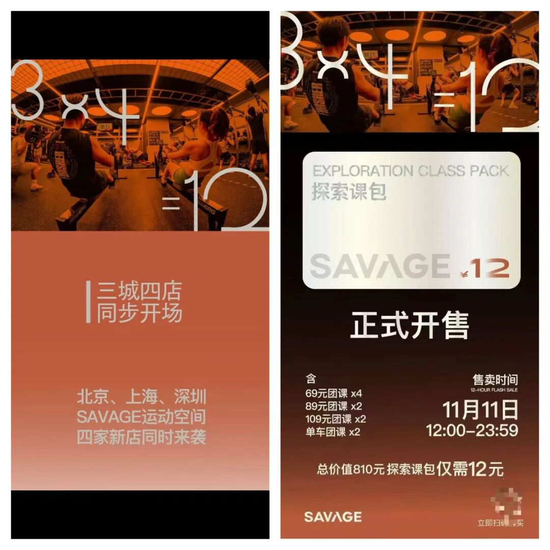 朴素的商战往往以最直接的方式打响——11月11日中午12点,新兴团课健身品牌Savage运动空间正式开售“探索课包”,只需要12元就能解锁10节团课。由于购买仅限当天,品牌小程序一度过载瘫痪,但即便如此,这一消息仍极速在健身圈扩散,余波未停。