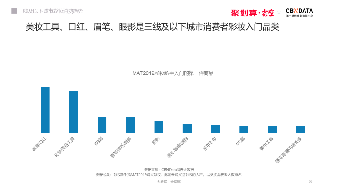 CBNData《报告》发现,口红、美妆工具、眉笔、眼影是三线及以下城市消费者彩妆入门品类。