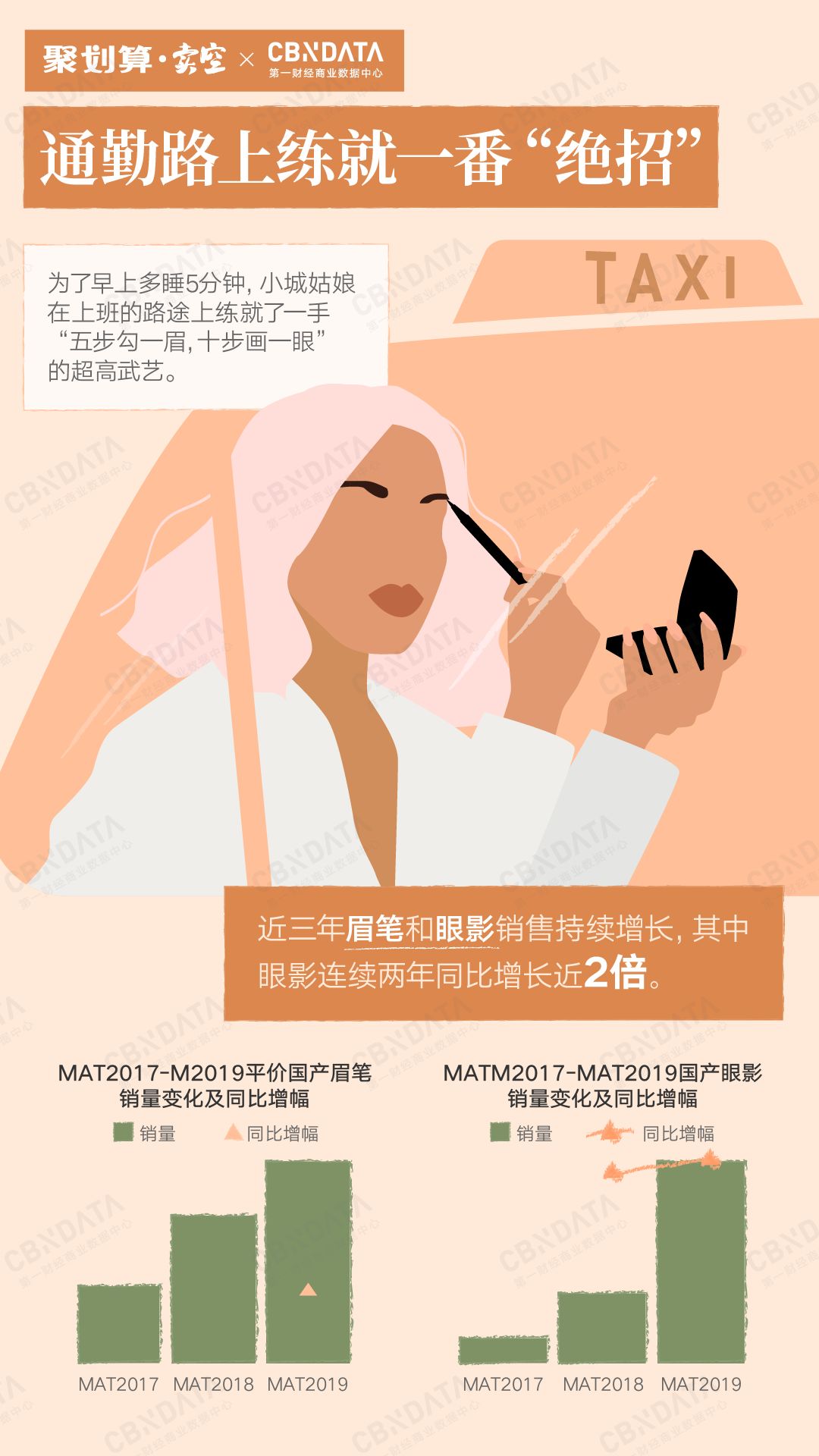 除了口红,眉笔和眼影也成为小城姑娘的彩妆入门必败品。CBNData《报告》发现,近三年来,三线及以下城市眉笔和眼影的销售持续增长,其中眼影的销量连续两个滚动年同比增长近2倍。“五步钩一眉,十步画一眼”的技能正在被越爱越多的小城姑娘GET。