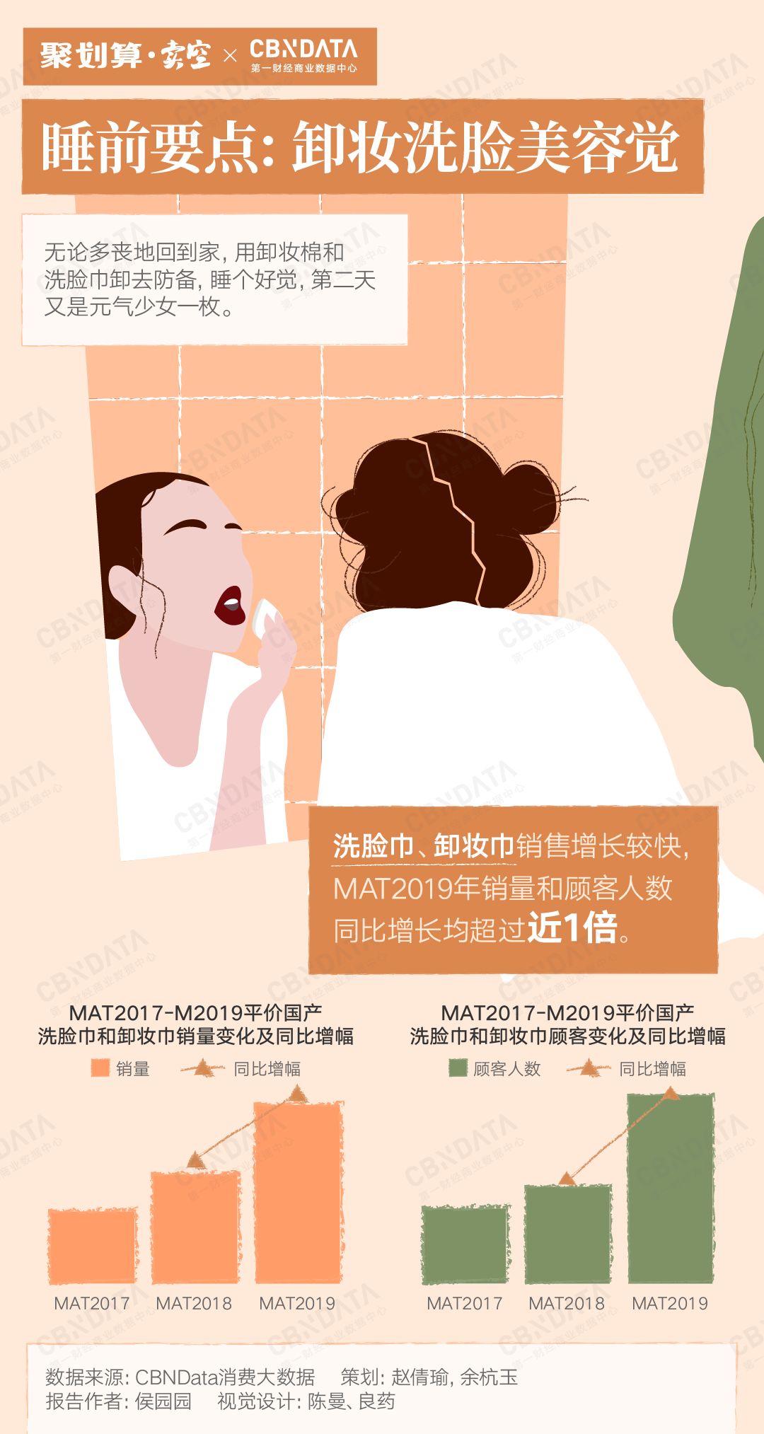 化妆和美妆工具中,洗脸巾、卸妆巾销售增长较快,2018年4月至2019年3月年销量和顾客人数同比增长均超过1倍,可见随着美妆使用习惯的养成,更多细分品类的市场也在被逐渐打开。
