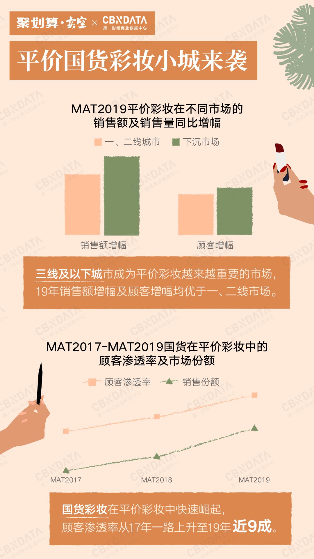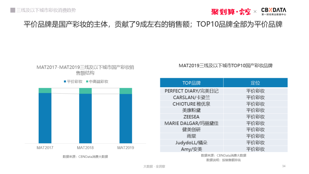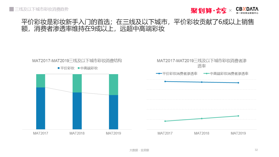 1 在三线及以下城市,平价彩妆贡献了六成以上的销售额,消费者渗透率超九成。