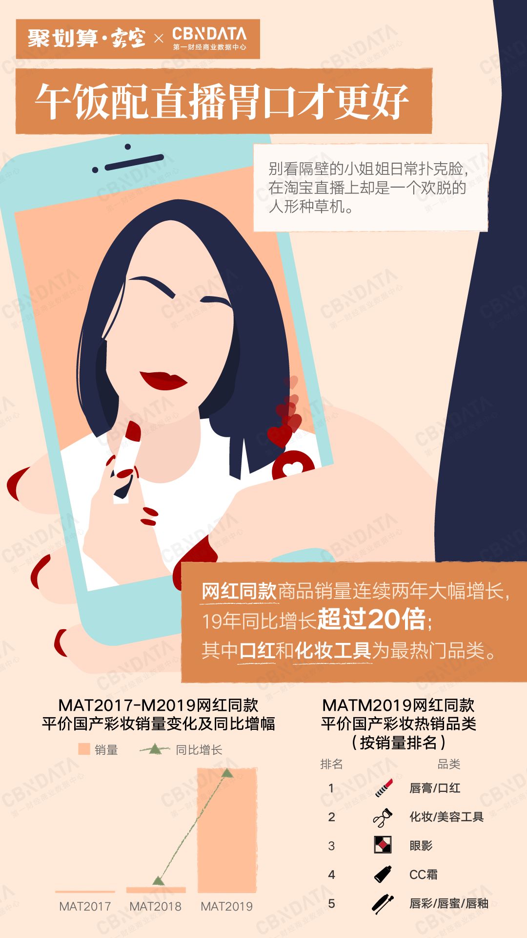 4 网红同款国货彩妆产品销量连续两年大幅增长,2018年4月至2019年3月同比增长超过20倍。