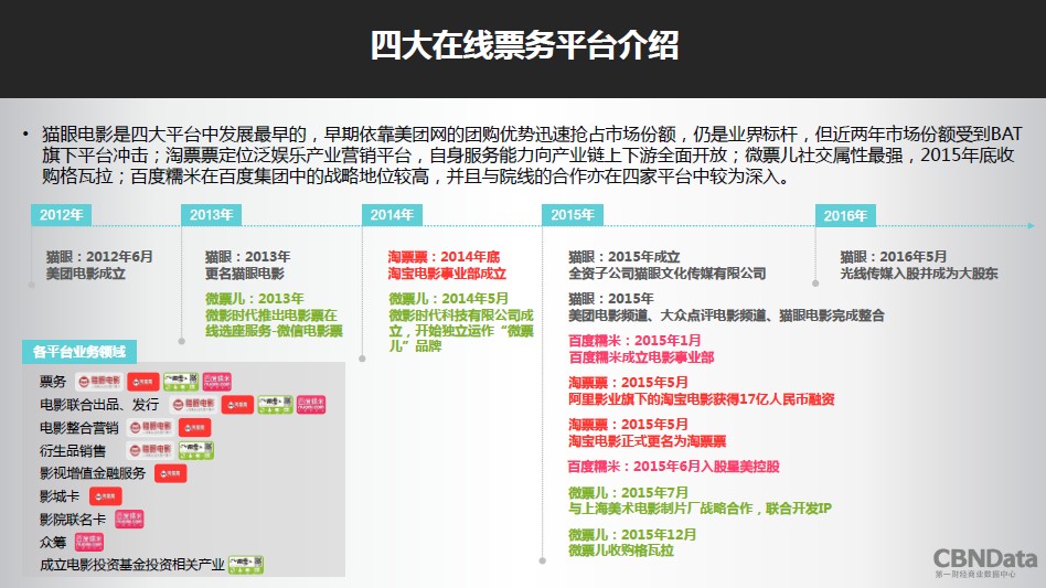 进入2016年,整体电影票房市场呈现增速放缓趋势,相比之下在线票务市场占有率持续走高,成为最主要的电影购票渠道,但占有率目前已接近饱和。作为需要投入大量资金补贴的在线票务行业,洗牌在所难免,收购、入股等资本运作发生频繁,在线票务平台正纷纷通过参与电影宣传、发行、进军泛娱乐业等动作取得更大发展。《报告》显示,随着BAT深入布局在线票务市场,“ BAT+猫眼”四巨头的行业格局已经形成,并且构筑了较高的市场壁垒。在线票务市场也正由“通过低票价补贴这一烧钱方式争取在线票务市场份额”的1.0时代,逐步过渡到“行业竞争格局稳定,呈现全链路渗透、社交化、泛娱乐平台化三大特征”的2.0时代。