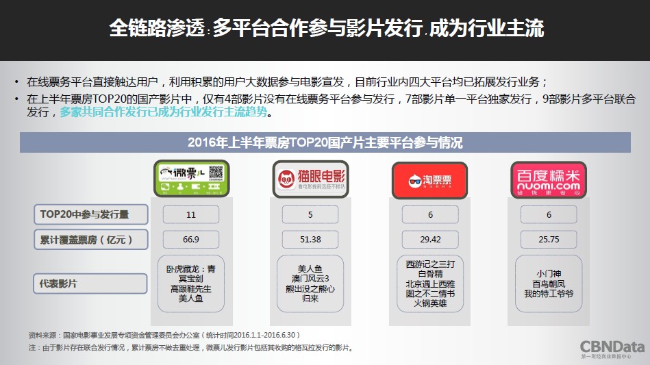 在线票务平台融合电商、泛娱乐、社交等基因,以内容制作、宣发到终端、渠道等多维度渗透。《报告》显示,在线票务平台利用积累的用户大数据参与电影宣发,目前行业内四大平台均已拓展发行业务。2016年上半年票房成绩前20的国产影片中,有16部影片由单一平台或多平台联合发行。在线票务平台也利用预售影片为宣传方提前精准定位目标观影群体,以便片方精准地投放营销资源,最大限度扩大在核心观影人群中的影响力。