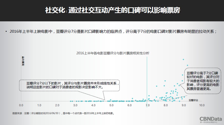 移动互联网时代,社交已成为观影体验中最重要且密不可分的一部分。《报告》显示,口碑能给电影带来较长期的观影需求。2016年上半年上映电影中,豆瓣评分7分是影片口碑影响力的临界点,评分高于7分的电影口碑对影片票房有明显的拉动作用。