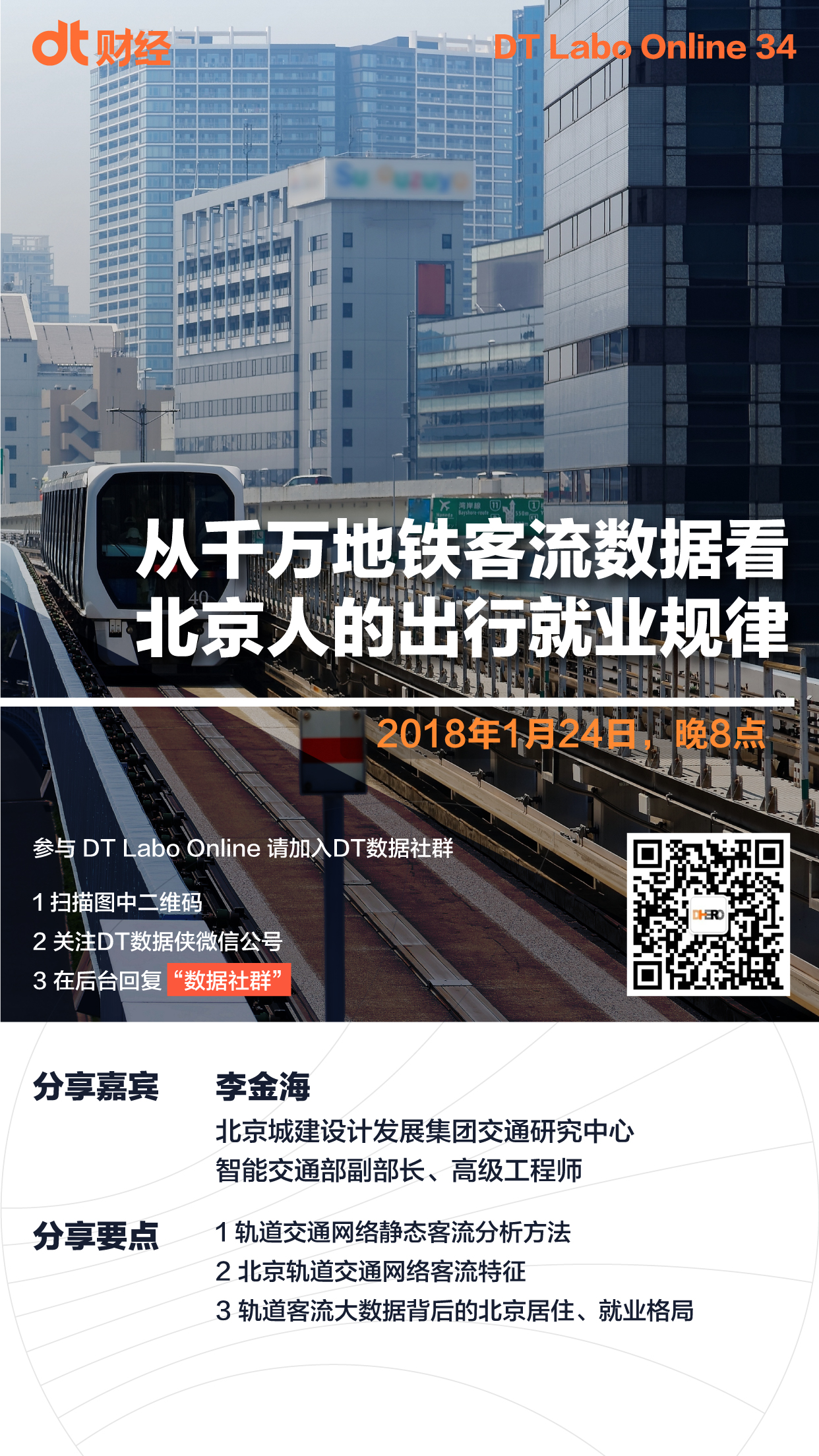 1月24日晚间8点的数据侠线上实验室,DT君邀请到北京城建设计发展研究集团交通研究中心智能交通部副部长、高级工程师李金海,为我们分享其在北京地铁客流数据分析、客流规律以及客流背后的北京区域格局等方面的研究发现。