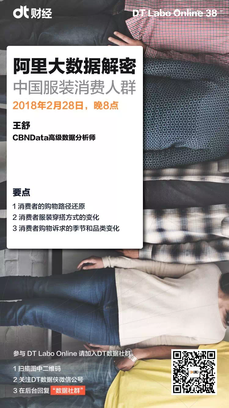 中国消费时代已到来!买买买自然也少不了服装消费。但你绝对不知道男生们喜欢周几去网上逛店,你也不清楚这些年大家服装消费的风格与方式发生了啥变化。2月28日晚8点的数据侠实验室,DT君邀请CBNData高级数据分析师王舒,用阿里大数据来洞察2018年服装行业年度消费者趋势。敬请期待!