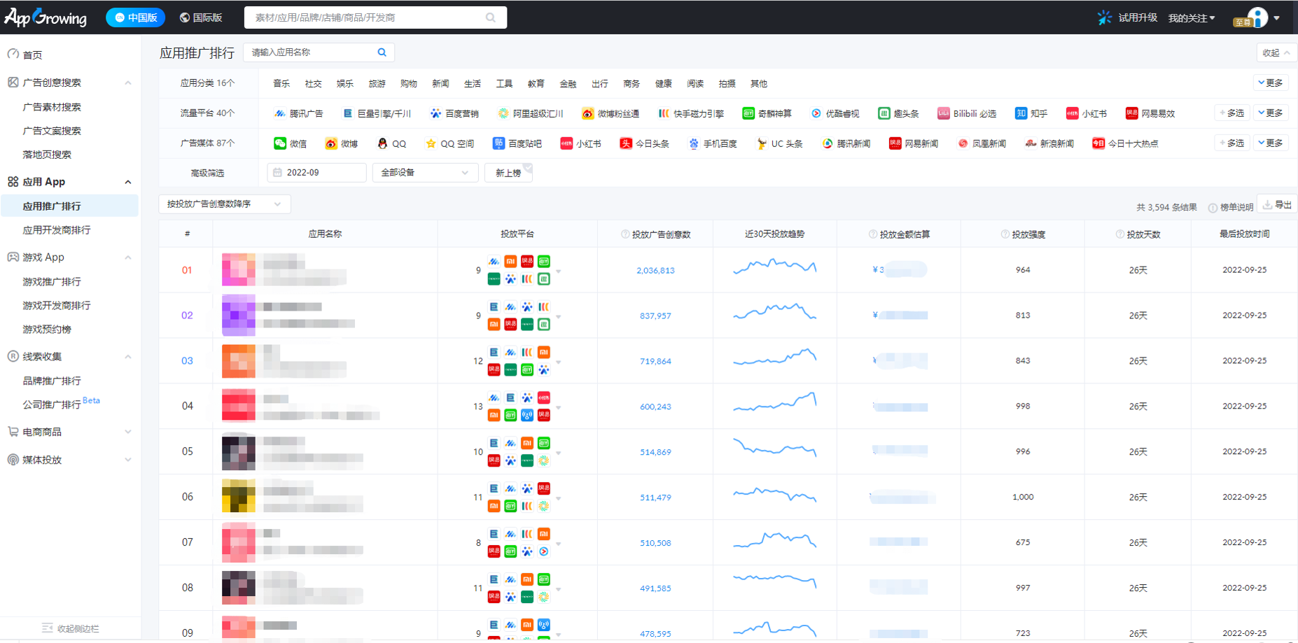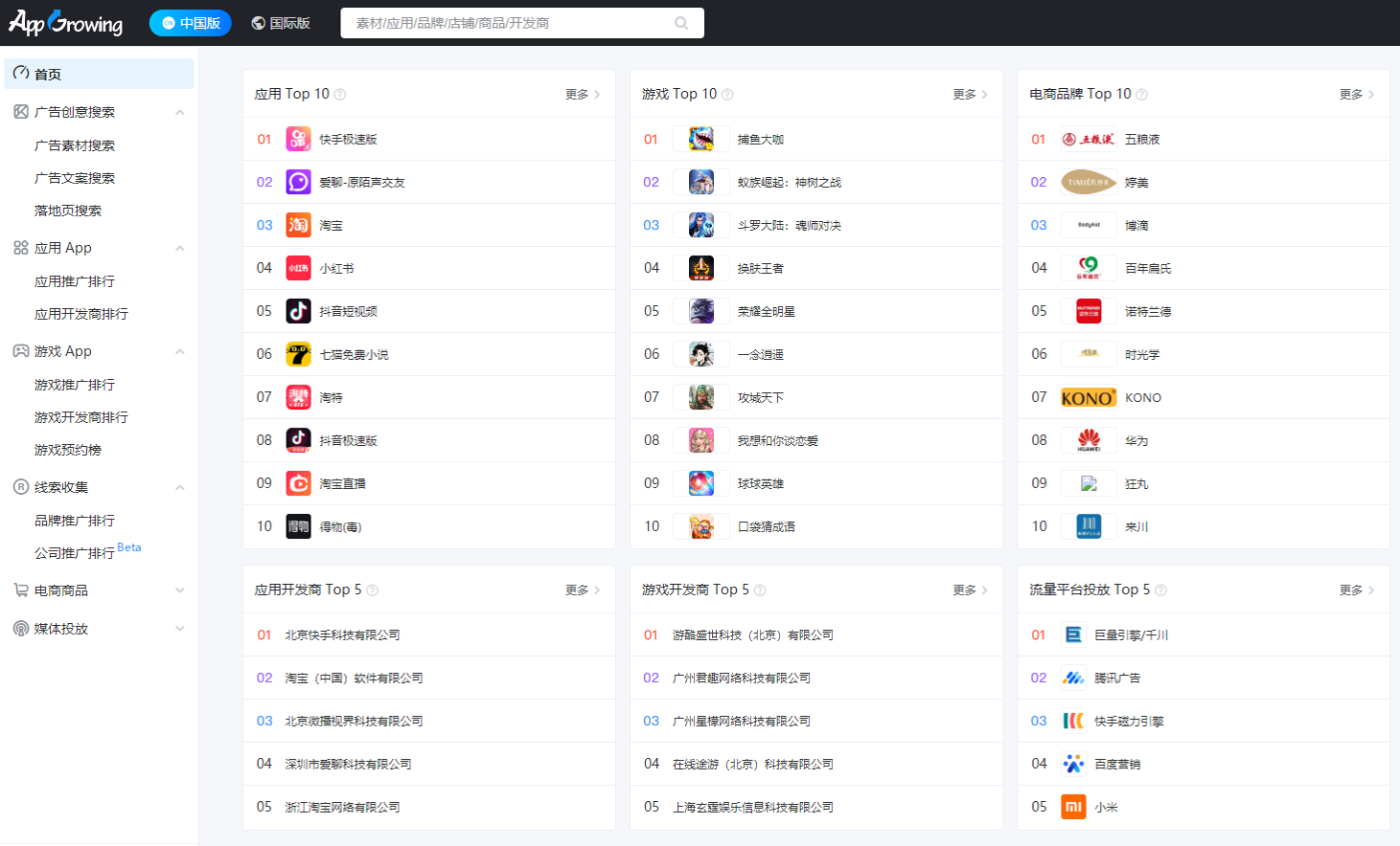 提供App 、App 开发商、流量平台、留咨公司推广排行,帮助用户掌握行业和竞品的买量情况,了解公司推广情报优化自身的投放策略和推广计划,洞悉移动广告行业的整体发展趋势。