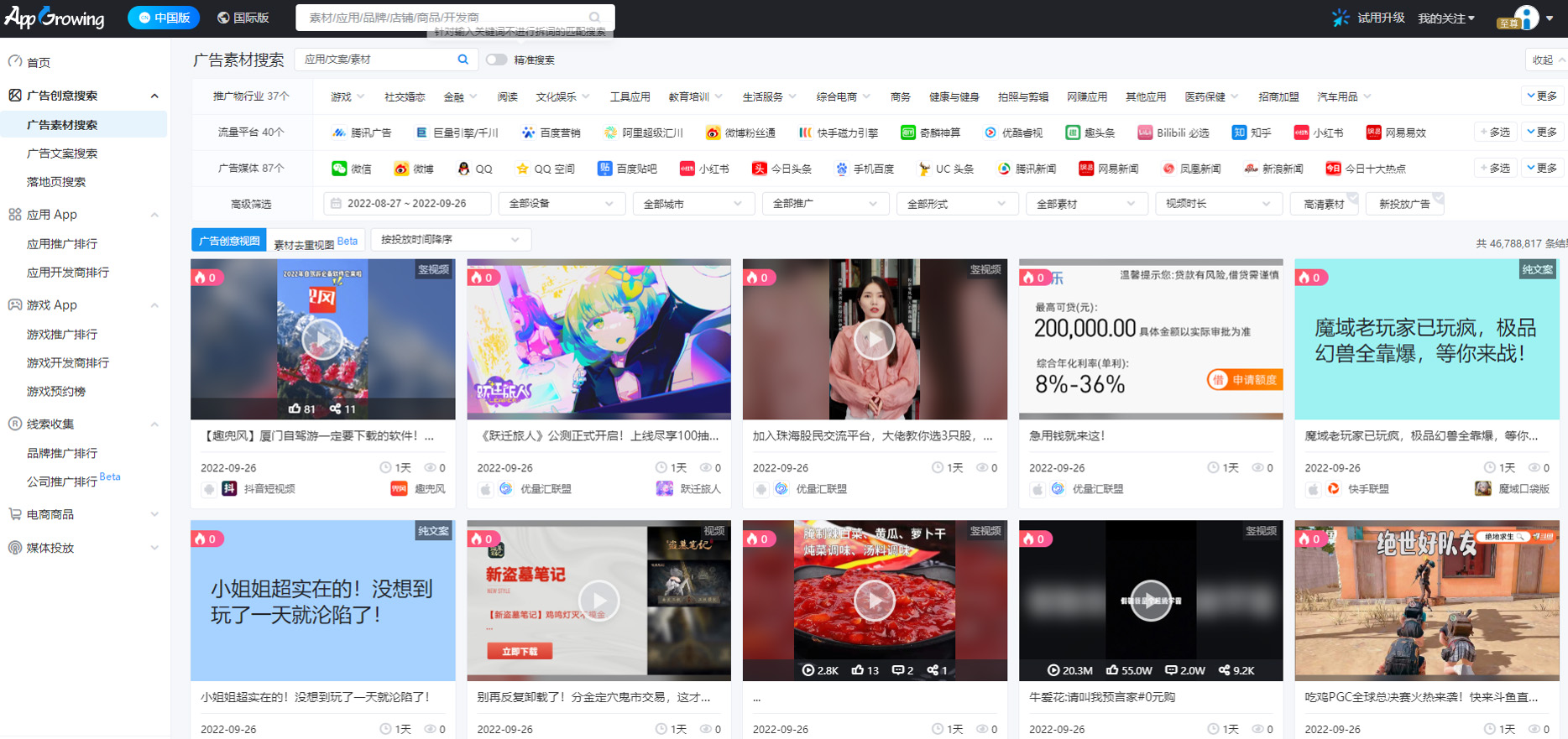 实时追踪主流广告平台的投放数据,覆盖游戏、金融、教育等超过28个细分行业,通过智能估算广告的广告活跃度、曝光量、点击量和转化量等数据,帮助快速筛选高转化素材,助力投放更高效。