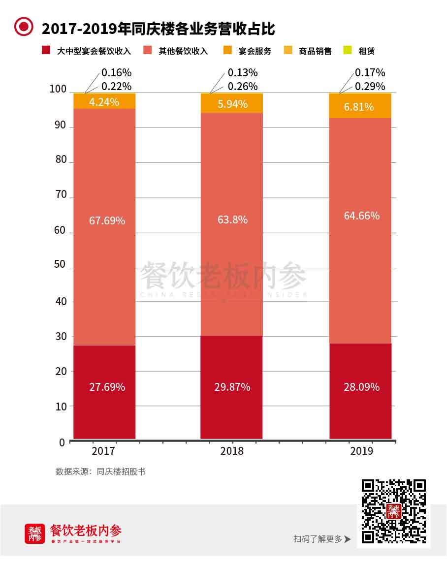 数据显示,同庆楼近三年的婚宴相关业务收入占比稳定在30%以上。2019年,其大中型宴会餐饮收入占比28.09%,宴会服务占比6.81%。