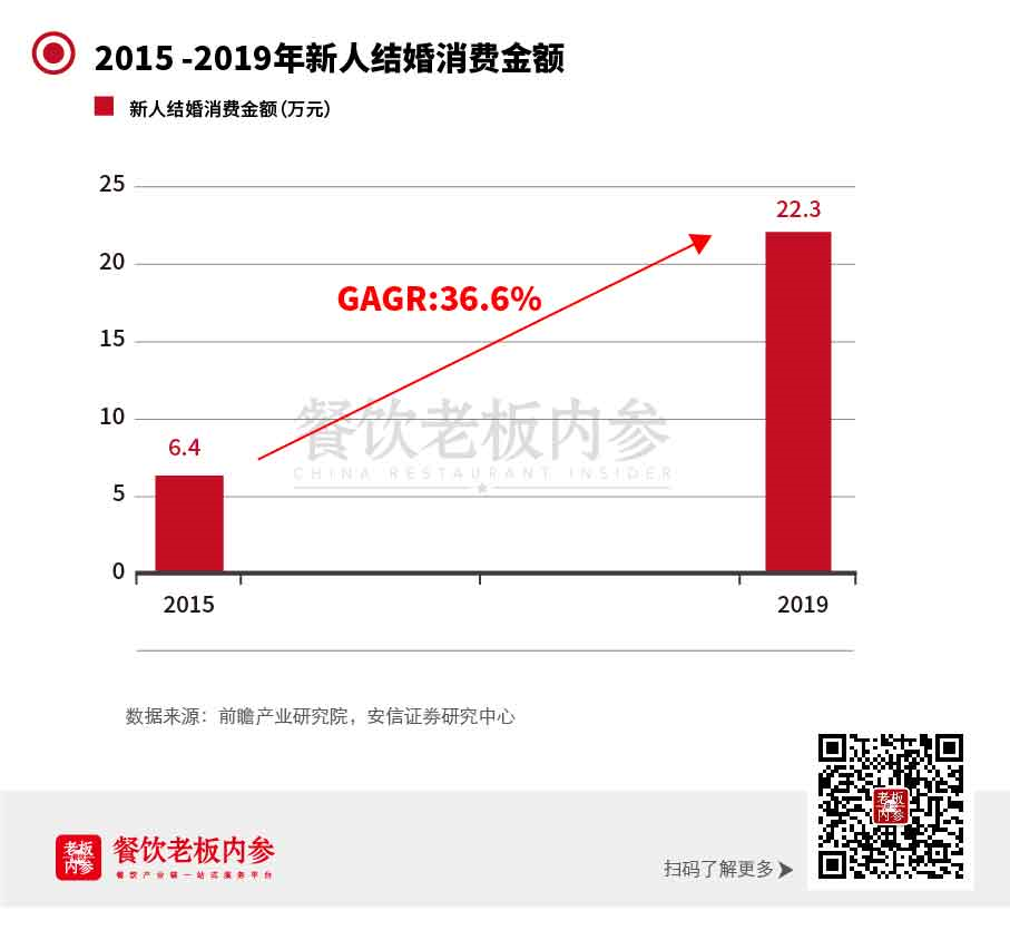 根据前瞻产业研究院数据,2019 年平均每对新人结婚消费金额为 22.3 万元,5 年复合增速达 36.6%。