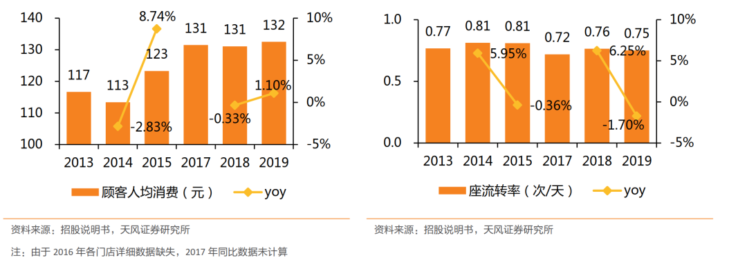 此外,在毛利率并不高的情况下,翻座率仅有0.75次/天就更令人担忧了。婚宴业务翻座率低实属正常,而在60%以上为其他餐饮的情况下,同庆楼的翻座率每天不足1次,便有待考究。