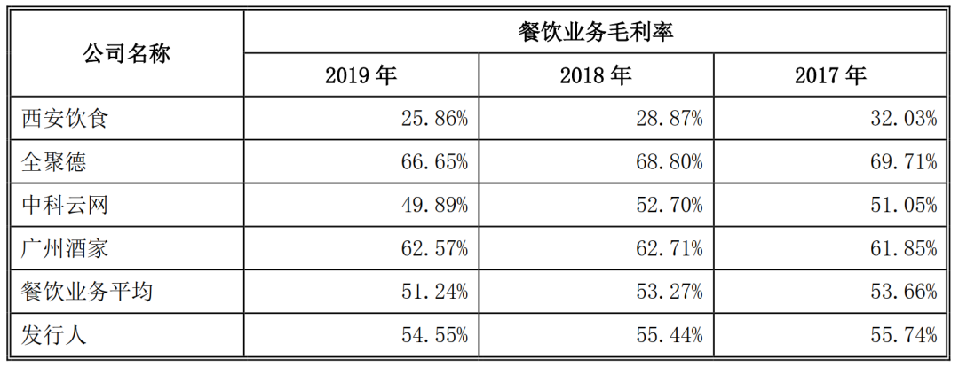 首先,同庆楼主营的餐饮业务毛利率并不算高,2019年毛利率54.55%,比餐饮业务平均水平略高。但是和A股其他餐饮企业对比,低于全聚德的66.65%和广州酒家的62.57%。