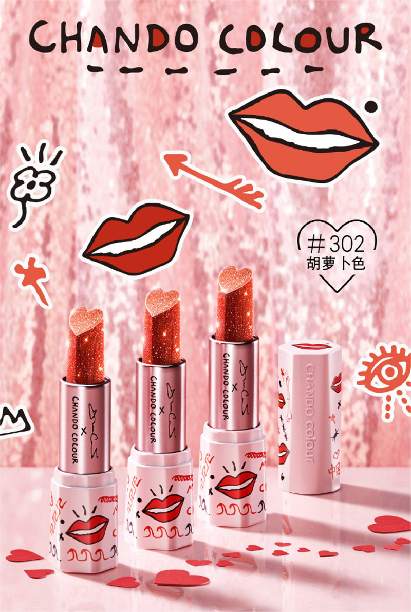 此外不同的色号拥有不同的主题涂鸦,在口红端顶端,包装色号标签上都有着不一样的细节设计。在大多数唇膏以圆管和方管的为主时,此次口红另辟蹊径,将外壳设计为六边形,横切面就像一片雪花的形状。其中爱心限量版的膏体则极具创意地制作成爱心形状。