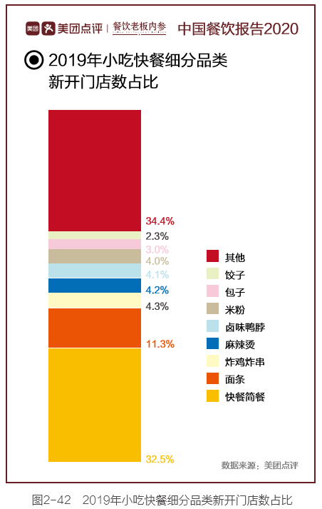 据《中国餐饮报告2020》显示,2019年,小吃快餐赛道里最大的细分品类是快餐简餐,能够满足顾客“吃饱”的刚性需求,占比32.5%;其次是米粉、面条、包子等主食,以连锁品牌模式布局,仅占比20.6%。