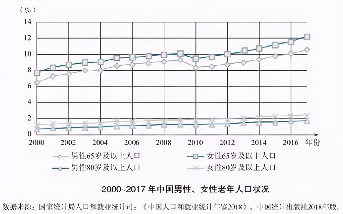 从全世界范围来看,高龄女性老年人口占比不断提升,是老龄化的一大趋势。与老年男性相比,老年女性的存活优势明显,联合国最新发布的《世界人口展望 2019》数据表明,在80岁及以上高龄老年人口中,老年女性的比例超过六成,超高龄老年群体中该比例则超过七成。