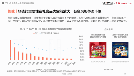 但在今年,一些变化正在发生,比如芝士味坚果和葡萄味糕点大受欢迎,高热高脂的巧克力糖果正在变得健康低卡,拆盲盒、体验皮影戏成为吃零食的新乐趣……从线上消费来看,零食礼盒的品类、风味正在变得越来越多元和新奇,吃零食不但能满足消费者的口腹之欲,也逐渐开始成为一件趣味十足的互动式体验。