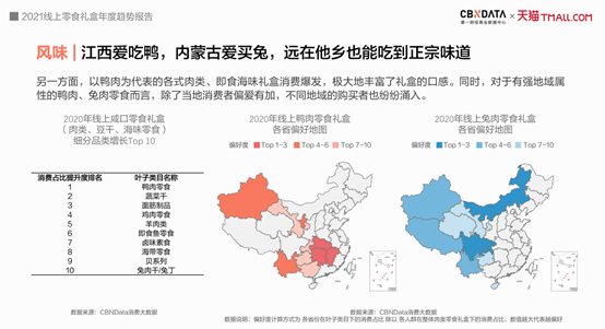 而在口感上,以鸭肉为代表的的各式肉类、即食海味礼盒消费爆发,极大丰富了礼盒的口感。对于有强地域性的鸭肉、兔肉等零食,除了当地消费者偏爱有加,越来越多不同地域的购买者也开始纷纷涌入。