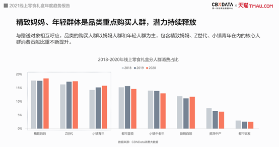 同时,消费人群也与赠送对象相互呼应,妈妈人群、年轻人群成为零食礼盒的主力买手,细分来看,包含精致妈妈、Z世代、小镇青年在内的三大人群。