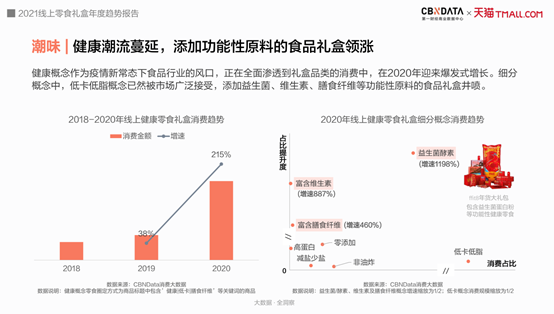 除了营销创新,零食品牌在产品上也做足功夫。疫情为食品行业带来了势不可挡的健康化潮流,也全面渗透到零食礼盒的消费中,在去年迎来爆发式增长。零食礼盒做起了“加减法”,其中低卡低脂概念广泛流行,添加益生菌、维生素等功能性原料的食品礼盒消费猛增。在人群偏好上,精致妈妈、资深中产等高消费力人群是益生菌概念的首批拥趸,而Z世代则更追求非油炸、零添加。