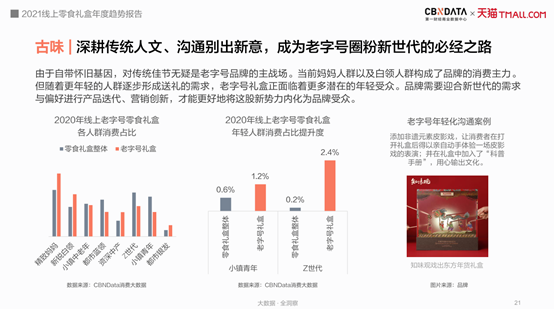 传统佳节向来是老字号品牌的主战场,而这届新生代消费者,在优渥物质条件下成长,拥有强大的心理自信、视野自信和文化自信,对国货和老字号品牌的印象也在持续好转。根据CBNData《报告》显示,2018年至2020年,线上国风零食礼盒消费增长了将近8倍。