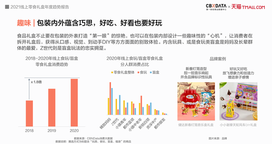 除了零食礼盒包装的“第一眼”的惊艳,在包装内部设计一些趣味性的“心机”也成为流行。拆开礼盒后,消费者能够从口感、视觉、到动手DIY等方方面面得到别致体验,必将提升零食礼盒的价值感。CBNData《报告》数据显示,内含玩具、或是食玩类盲盒是妈妈及长辈群体的最爱,Z世代则是盲盒玩法的忠实拥趸。