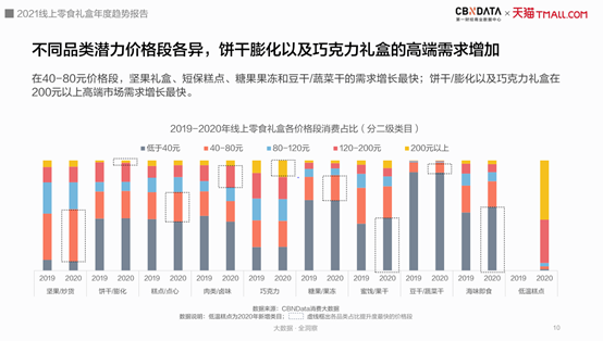 从购买力上来看,近年来整体礼盒消费呈现出两端化发展趋势,低于80元、高于200元的礼盒呈现出可观的增长潜力。不同细分品类的潜力价格段有所不同,如40-80元的坚果礼盒消费显著提升,200元以上的高端饼干、膨化食品礼盒增长得最快,但这两个价格段当前的供给比例低于需求比例。