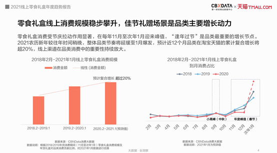 CBNData《报告》显示,逢年过节是零食礼盒最重要的增长节点,通常在每年11月到次年1月迎来峰值,2021年农历新年相较往年时间稍晚,整体品类节奏预计延缓至1月爆发,近12个月累计复合增长将超20%。