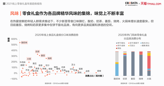 热爱尝鲜、乐于探索是这届年轻消费者的代际“标签”,在他们的需求推动下,零食礼盒出现了诸多新晋口味,根据CBNData《报告》数据显示,酸奶、奶茶、番茄、烧烤、火锅味增长速度最快。