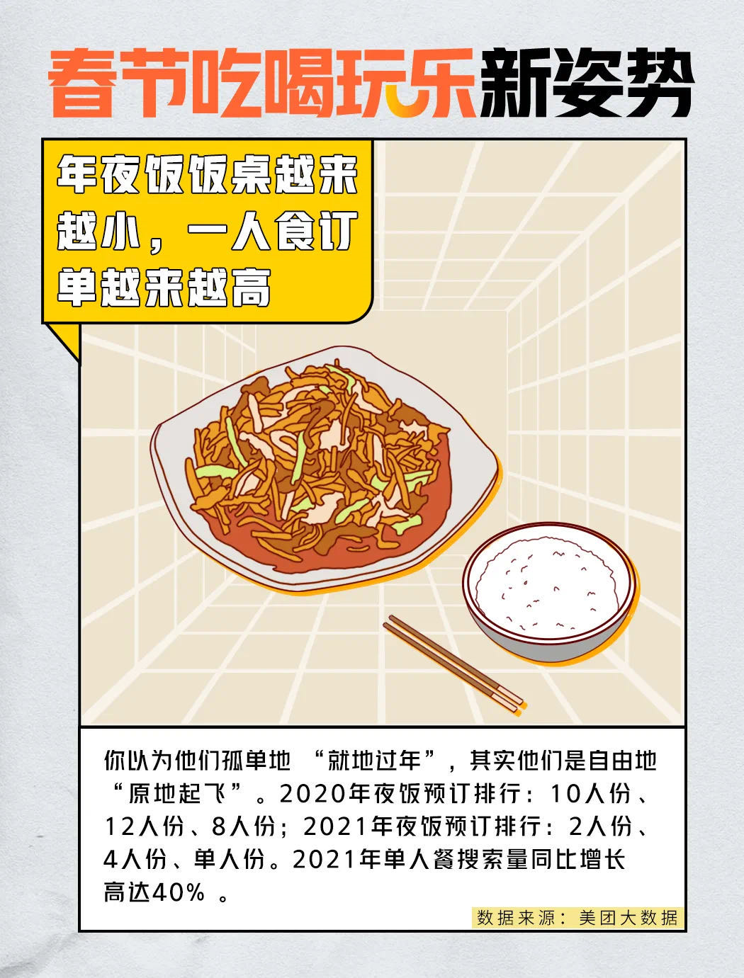 与线下年夜饭讲究人多热闹不同,线上年夜饭更强调“小而美”。作为“原年人”的第一个春节,单人餐成为今年除夕的消费热点,据悉,北京“一人食”年夜饭订单量占比增幅384%,可见其火爆程度。