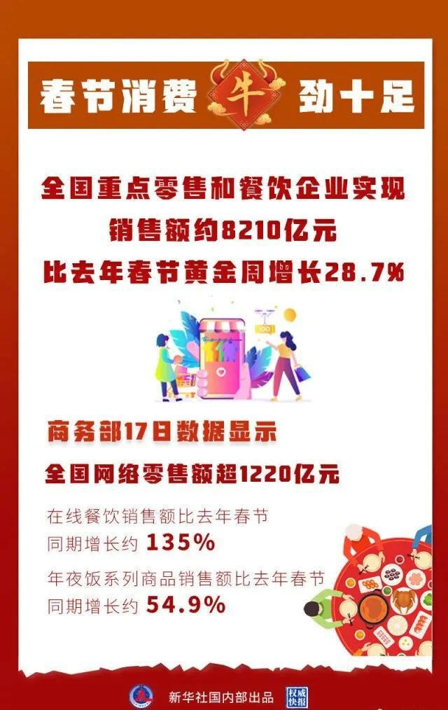 近日,商务部发布数据显示,2月11日(除夕)至17日(初六),全国重点零售和餐饮企业实现销售额约8210亿元,比去年春节黄金周增长28.7%。其中,在线餐饮销售额比去年春节同期增长约135%,年夜饭系列商品销售额比去年春节同期增长54.9%。
